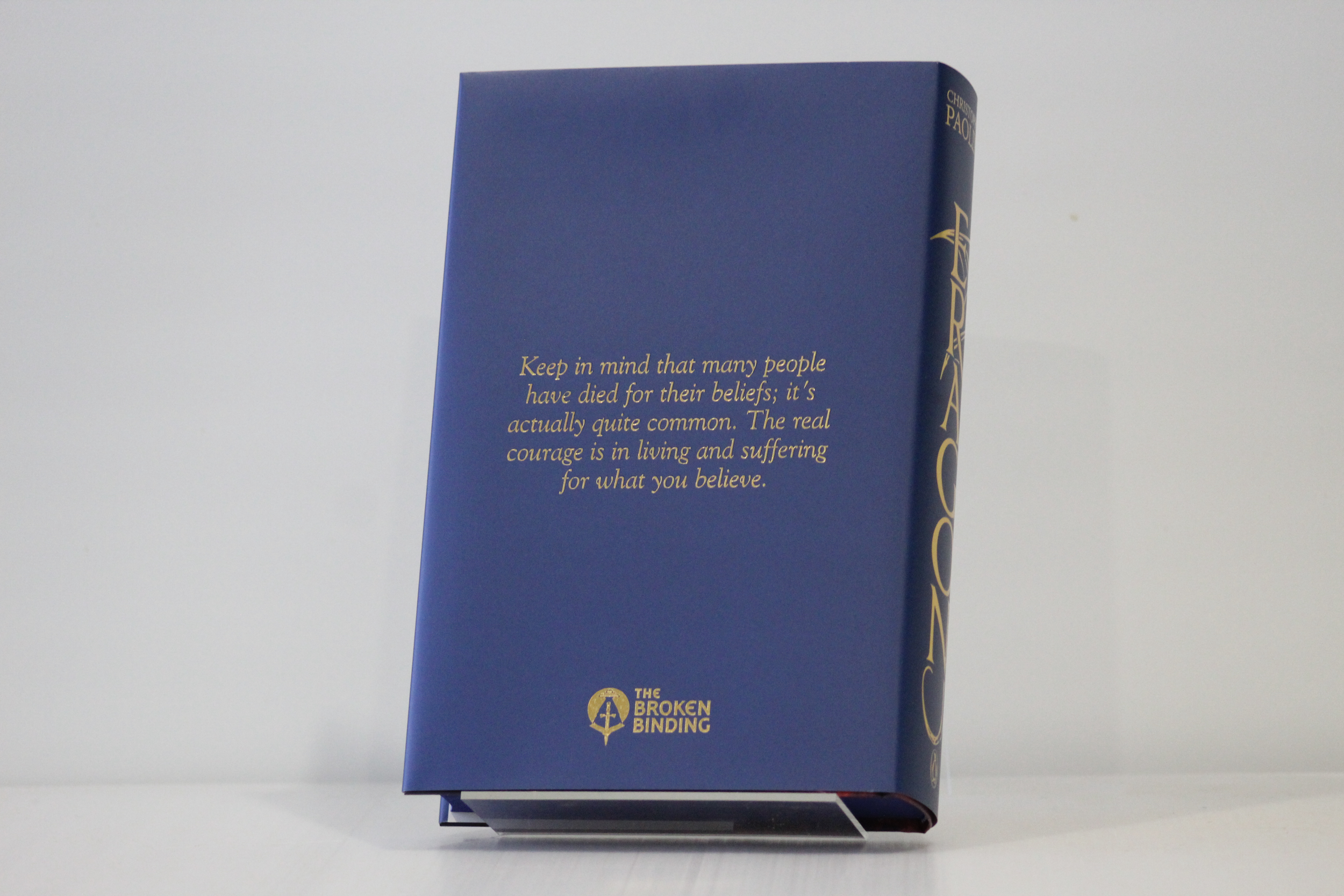 The Broken Binding editions of the Inheritance Cycle were first teased on October 29, 2024. The art direction was done by Eon van Aswegen and Petrik Leo. (Petrik worked mostly on the dust jackets and Eon on everything else.) With Christopher's agreement, the dragons on the covers were reordered/changed to better suit their roles in the books. 10,000 sets were printed, with Christopher hand-signing 40,000 tip-in sheets. These books contain no extra text content.