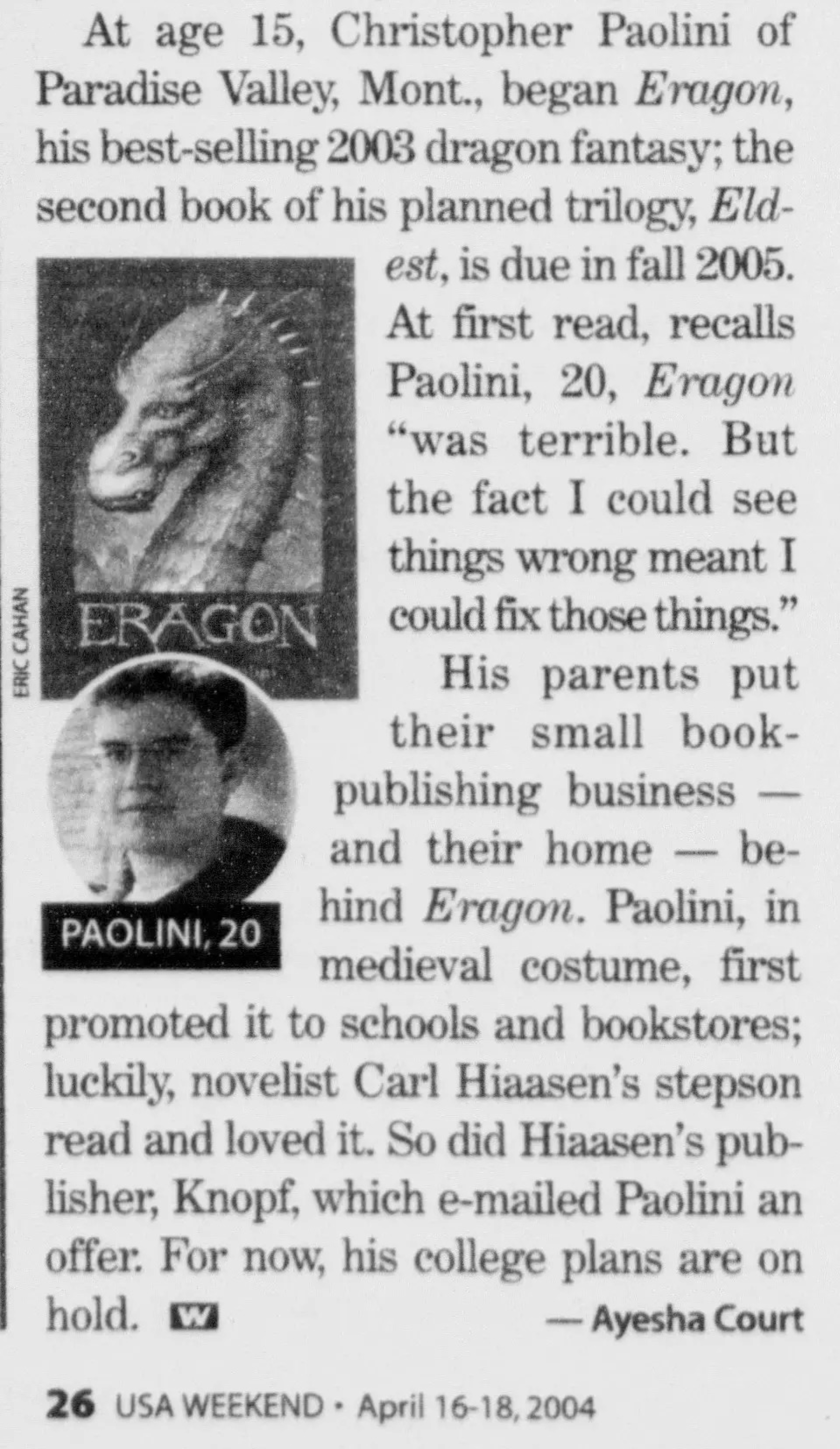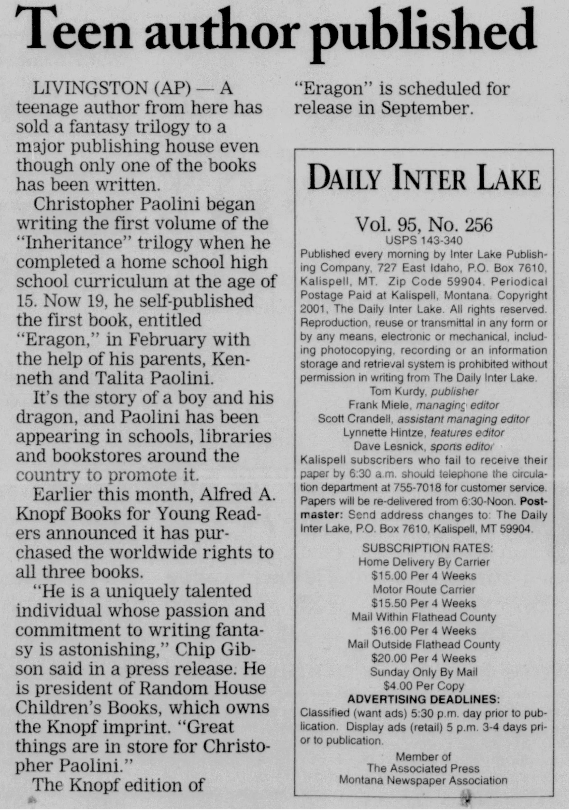 The story goes that author Carl Hiaasens bought his stepson a self-published 2002 Eragon. His stepson loved it. Carl had multiple of his own books published with Knopf and shared the book with his editor at Knopf. Knopf approached the Paolinis on October 24th, 2002 to publish Eragon, Scholastic also approached them two days later, but ultimately they chose to go with Knopf.