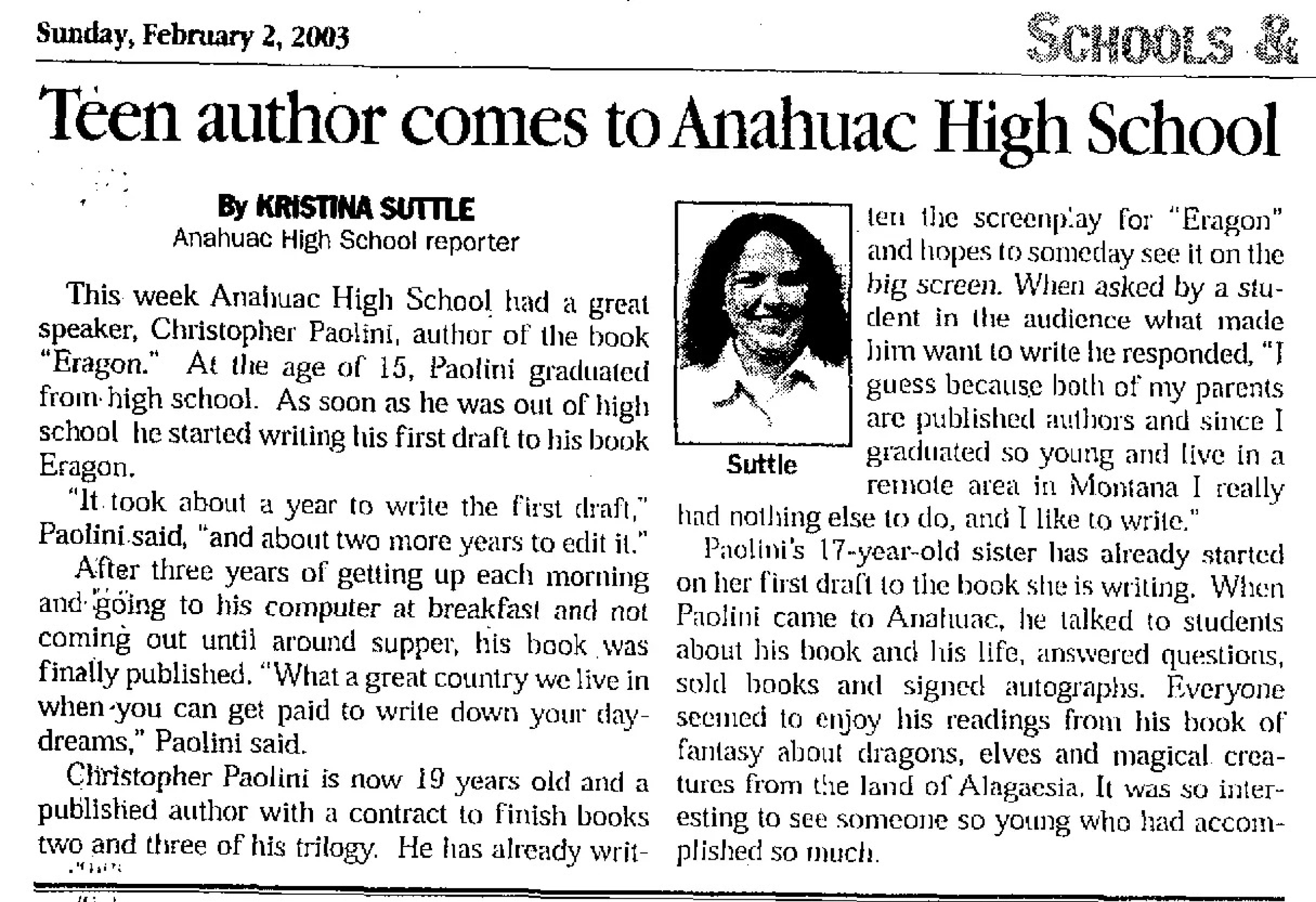 "Michelle Frey, an editor at the Alfred A. Knopf publishing company, sent us an e-mail query that started with: “I’m writing regarding your novel, ERAGON, which I recently read and enjoyed immensely.” The rest has been the continuation of a very happy publishing tale " - Kenneth Paolini (Chris’s father)
