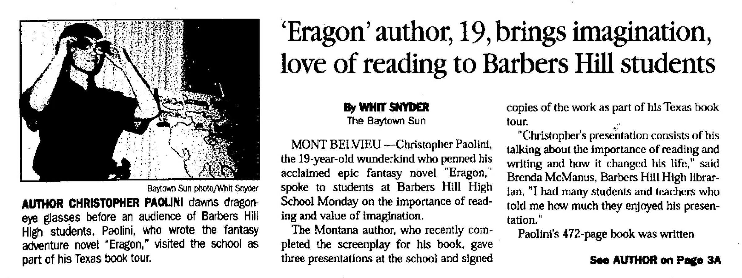 It was a big risk for Random House. And it was a big risk for me because the book was successful, self-published, and we knew that giving it to a publisher, you lose the rights to a degree, and most books don't turn a profit, and it could have just ended up in the remainder bin. So what really worked in my favor is that Random House, and specifically Random House Children's Books, and specifically the imprint of Knopf, which is where I'm at were looking for their own Harry Potter, essentially. Scholastic was publishing Harry Potter. And Scholastic also gave me an offer for Eragon, but I could tell that Random House was the one that really loved the book and Scholastic was doing it because they thought it was a good business opportunity. Scholastic actually offered more money than Random House. But I went with Random House and it was the right choice. And I found out after the fact that Chip Gibson who was the head of the children's department at the time basically chose to use Eragon as sort of something to rally the troops and put the entire children's division behind it, and I was the very fortunate recipient of that love and attention. Which of course would only get you so far if people didn't enjoy reading the book. But fortunately for me, they did a great job marketing it and then people actually enjoyed the book. Which is why when people ask me how to get published, it's like, what am I supposed to say? The answer ultimately is you write a book that people want to read, and that's a facile answer, but it is true. If people want to read it, it makes everything else easier. The agent wants you, the publishers want you, and ultimately the public wants you. - Library Speakers Consortium - 20 Years of Dragon-Riding
