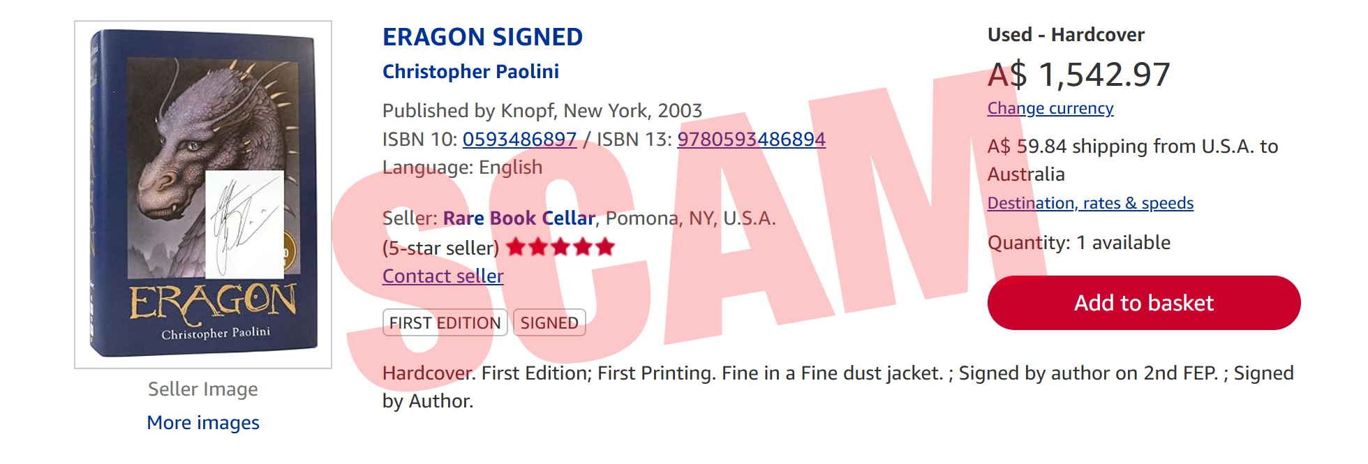 How to spot a scam? Make sure the dustjacket has the correct ISBN on the back (9780375826689). Check that the copyright page only has two ISBNs (trade and lib.bdg) and the correct number line for first print (10 9 8 7 6 5 4 3 2 1).